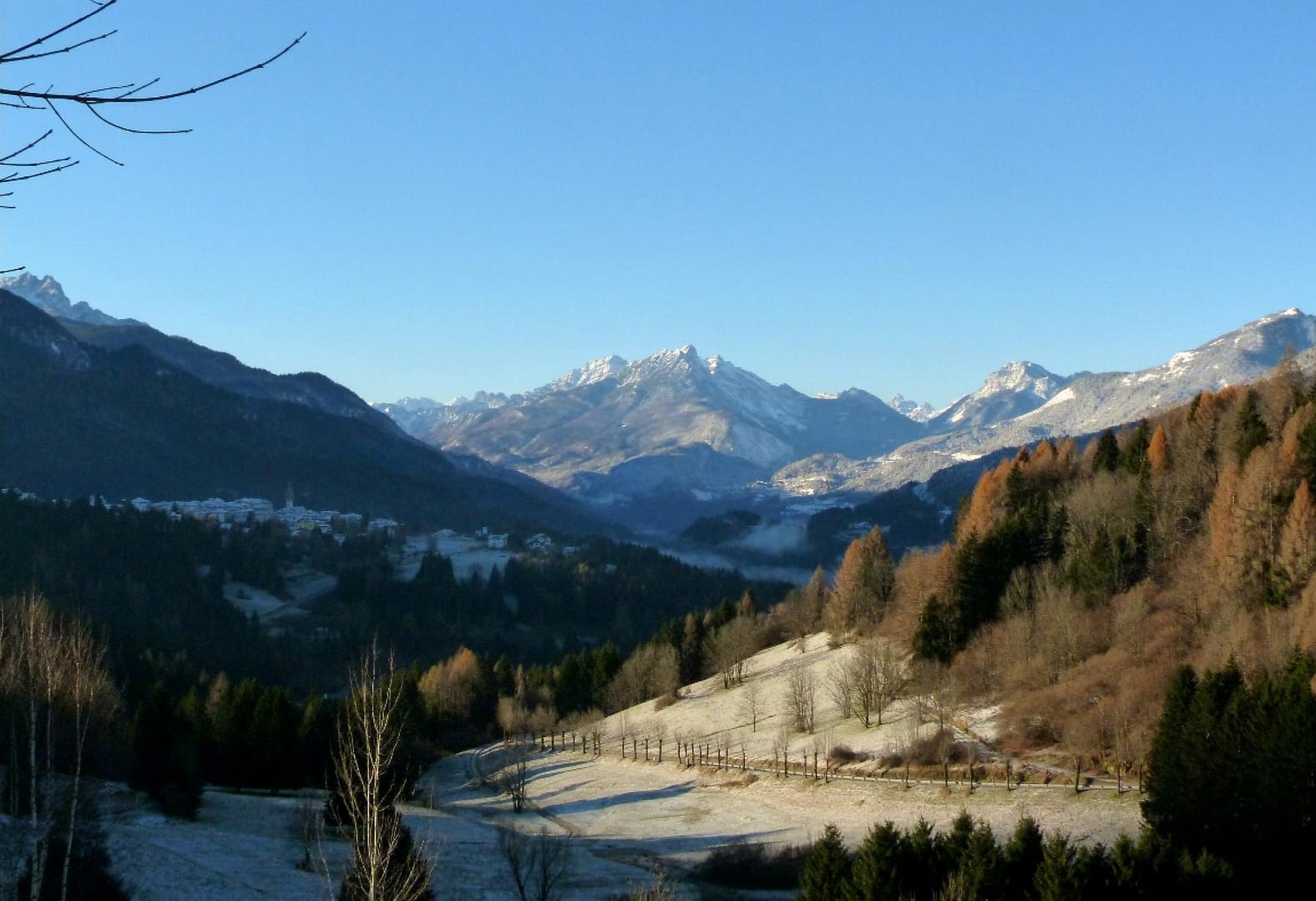 Dal bar «Triestina» si va verso la Chiesa di Laggio e una stradina asfaltata scende piuttosto ripida in località Longiarìn lungo il corso del Rio Laggio, fino ad arrivare ad un’area pic-nic attrezzata. Si prosegue in discesa fino a giungere in località Navare. Da qui, percorrendo per un breve tratto la SS 52, si arriva a Pelos. Si svolta a destra in via Piane e, alla Chiesa di Pelos, si prosegue in salita su via Pra fino a raggiungere l’eliporto. Qui inizia una forestale che porta al campo sportivo, da dove si stacca una stradina per la batteria e la trincea di Col Pelos (1889). Si torna sulla forestale e si sale fino a giungere a Vigo in località Palù e poi nei pressi di S. Orsola. Si imbocca via Pietro Da Rin Bettina e si torna al punto di partenza a Laggio passando da un suggestivo balcone panoramico sul Centro Cadore.