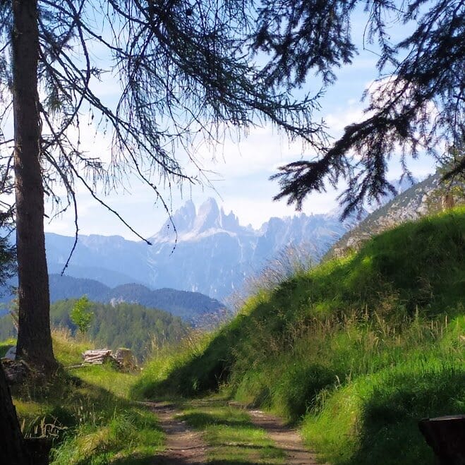 Strada sterrata in salita e sentiero nel bosco in discesa.